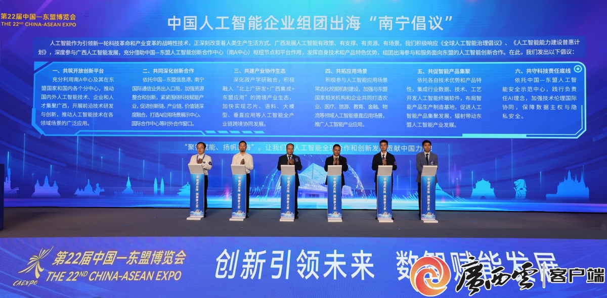 活動現場發布了《中國人工智能企業組團出海“南寧倡議”》。廣西云-廣西日報記者 黃克 何學俏 攝 自治區領導周異決、廖品琥,柬埔寨發展理事會副秘書長林維薩,以及中國與東盟有關國家人工智能領域的專家、機構代表,東盟國家有關部委、地方政府專業協會、商會代表,中國與東盟國家優秀人工智能企業代表,全區14個設區市有關負責人等參加活動。活動現場發布了《中國AI出海未來獨角獸企業TOP100榜單》和《中國人工智能企業組團出海“南寧倡議”》,并舉行榜單授牌儀式;上海人工智能產業研究院院長朱兆穎,《中國AI出海未來獨角獸企業TOP100榜單》上榜企業代表分別作主旨演講和企業分享。 |