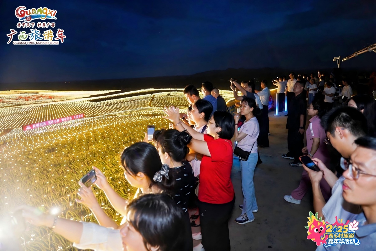 活動現場嘉賓游客共同點亮火龍果基地的“萬畝星河”。主辦方供圖 晚7時,鄉村旅游嘉年華在金穗萬畝火龍果示范基地拉開帷幕。自治區文化和旅游廳、自治區農業農村廳、自治區商務廳、南寧市人民政府相關領導和嘉賓約800多人參加活動。隨著活動嘉賓共同按下點燈開關,隆安金穗火龍果產業基地萬畝燈光瞬間點亮,如同進入璀璨星河似夢如幻。自治區級非遺隆安稻草龍,身披五彩燈帶,在萬畝星河間起舞,如同火龍降落人間,與現代光影在此刻碰撞出獨特的魅力。現場相機快門聲、歡笑聲、贊嘆聲交織。