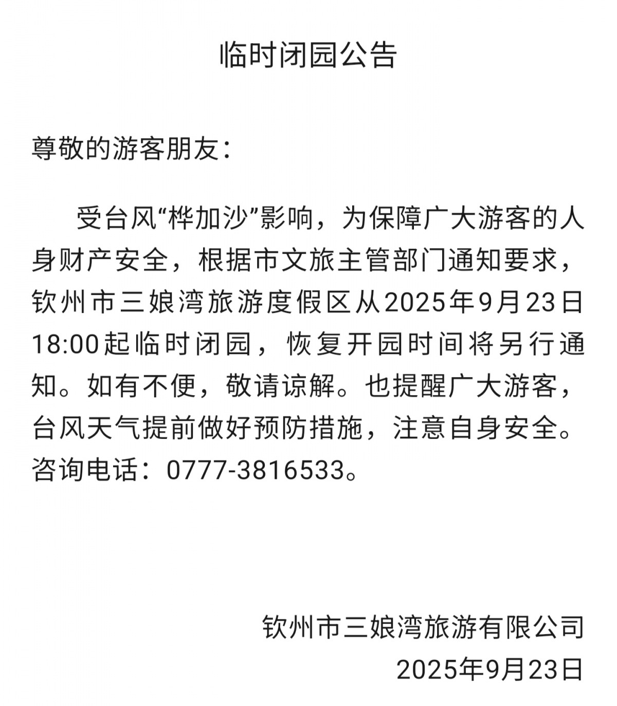 受臺風“樺加沙”影響,欽州多個景區臨時閉園 |