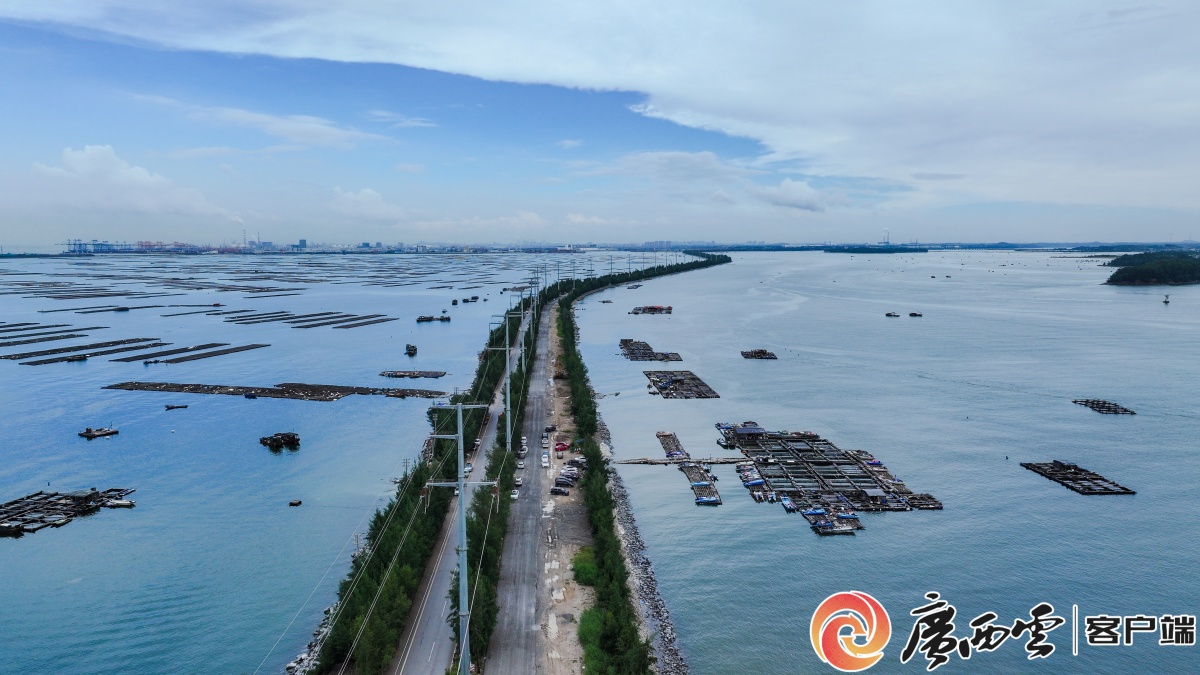公路一側,依舊水清沙凈、漁舟唱晚。通訊員 陸敏 攝 一條公路兜住了生態底線,但三墩公路的意義遠不止于此。作為連接陸地和欽州港三墩港區的唯一公路,其建設伊始就帶著向海而興的藍色基因。 此次采訪,正遇上三墩公路擴建,一路上施工機械往來不斷。公路的建設管理單位——欽州臨海集團土整公司副總經理花維玄介紹,工程預計10月底完成,由2車道變成4車道全瀝青路面。未來還規劃擴至8車道,以滿足日益增長的人流、物流需求。 公路盡頭的三墩港區,是片“向海而生”的土地。 原來的三墩,是十萬大山沒入大海的余脈形成的三座島墩和一片沙壩。由此往南,便是深海。欽州港的建設者們看中這里獨特的地理優勢,吹沙填海建造深水碼頭和工業園區,曾創造一天填海40畝的“欽州速度”。 至今,三墩港區已填海超4000畝,建成廣西首個30萬噸級油碼頭,開辟了長約40公里、深達25米的深水航道,吸引了中石油、中船、文船重工、桐昆等企業的數十億乃至百億級大項目落地。 走在港區,處處是火熱的生產景象。30萬噸油碼頭上,細長的輸油管道直通外海;化工園區里,桐昆石化一期項目各種管廊網絡已現雛形,預計年內實現投產……三墩仍在不斷生長,公路就像一條大動脈,源源輸送著養分與活力,讓逐夢深海的藍圖愈發清晰。