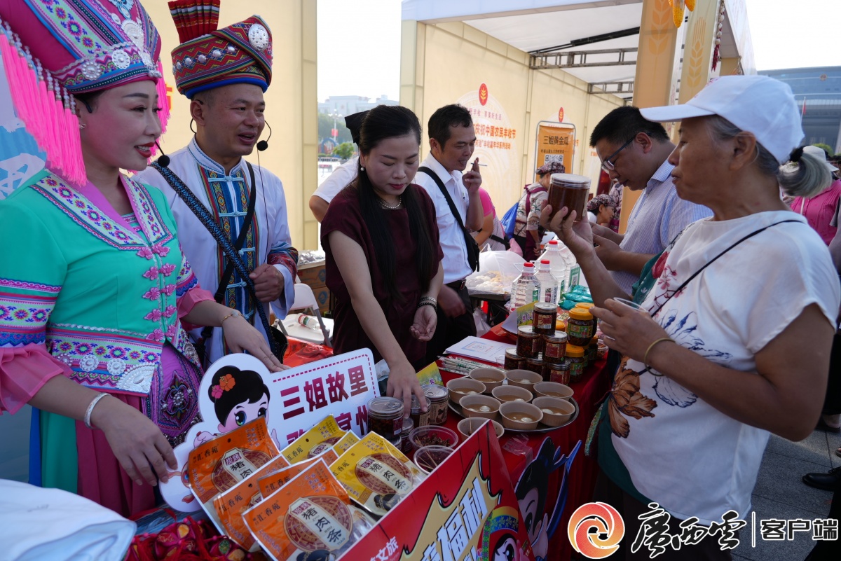 豐收節農趣比賽抱南瓜比賽。 跨省協作 黔桂粵共謀發展 “今年的河池豐收節不一樣,我們特邀了貴州省黔南布依族苗族自治州、深圳市等地的商家和相關服務機構參加,以跨省協作促進鄉村振興。”河池市農業農村局副局長韋發才介紹。 啟動儀式上,貴州省黔南布依族苗族自治州主要領導率團出席并致辭,表達了深化黔桂兩地農業協作的意愿。作為西部陸海新通道重要節點,黔南州與河池在桑蠶、文旅、物流等領域已形成緊密合作關系。 儀式現場,深圳標準促進會秘書長代旭暉代表深圳方面,為河池新增獲評“圳品”的鳳山縣同富健康產業有限公司、廣西巴馬印象生活體驗產業有限公司、大化宏富種養專業合作社三家企業頒發“圳品”證書。深圳標準促進會作為“圳品”認證的核心技術支撐單位,通過“高標準市場+高質量產區”聯動模式,助力河池特色農產品對接大灣區消費市場。 深圳標準促進會秘書長代旭暉為河池新增獲評“圳品”的企業授牌。 “通過‘圳品’,一是幫扶河池的農業產業標準化升級,二是有效賦能消費協作,推動更多的河池優質農產品走進深圳市場。我們歡迎河池的企業和農產品積極申報‘圳品’,以‘圳品’賦能產業高質量發展。”代旭暉表示。 深圳知名流通渠道代表、本來生活集團戰略中心項目總監梁宇軒現場介紹“圳品”銷售合作模式,宣布將為河池“圳品”企業提供“零門檻入駐+流量扶持”服務。 目前,河池已有12家“圳品”企業入駐本來生活平臺,2024年線上銷售額突破1200萬元。該集團還計劃在深圳設立“河池農特產專區”,通過直播帶貨、社區團購等方式擴大產品覆蓋面。以巴馬麗瑯、九千萬等“圳品”飲用水企業為例,依托長壽生態資源,產品遠銷東盟及歐美市場,2024年出口額突破3000萬美元。 據了解,目前河池累計通過“圳品”認證企業達67家,產品覆蓋飲用水、食用油、特色農產品等32大類。 游客紛紛品嘗、購買河池生產的土特產。 全鏈發展 蠶桑業引領風騷 本屆豐收節,河池各地參展的特產琳瑯滿目,其中宜州蠶桑產業供銷大集以“金絲智繪·河池集錦”為主題引領風騷。現場,河池打造“永不落幕”的蠶桑產業品牌推廣活動,圍繞河池蠶桑產業鏈技術及產品,以“蠶桑+數字”“蠶桑+文旅”“蠶桑+直播”等形式,全方位展現產業成效及優質產品,通過“一個大集”“一場盛宴”“一場直播”,打造河池蠶桑產業供銷大會IP,提升產業軟實力。
