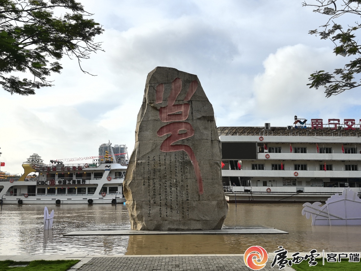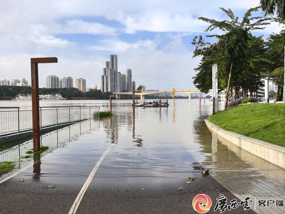 10月1日上午的南寧民生廣場,水已淹沒部分親水平臺。記者 周 映 攝 自治區水文中心預測,未來1—5天,左江支流水口河崇左市龍州縣水口鎮河段將繼續上漲0.5米左右,出現超警4.5米左右的洪水(警戒水位140.5米); 干流龍州縣城河段將繼續上漲1米左右,出現超警5米左右的洪水(警戒水位117.2米); 支流黑水河崇左市江州區新和鎮河段將繼續上漲0.5米左右,出現超警3米左右的洪水(警戒水位121.2米); 支流明江寧明縣東安鄉河段(警戒水位117.9米)至寧明縣城河段(警戒水位116.0米)將繼續上漲0.5米左右,出現超警2米左右的洪水; 干流崇左市區河段將繼續上漲3米左右,出現超警5米左右的洪水(警戒水位101.2米); 干流扶綏縣城河段將繼續上漲4米左右,出現超警4米左右的洪水(警戒水位81.8米)。 右江干流隆安縣城河段繼續上漲2米左右,將出現超警2.5米左右的洪水(警戒水位85.0米)。