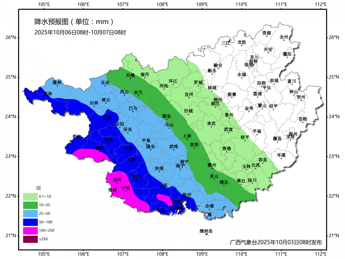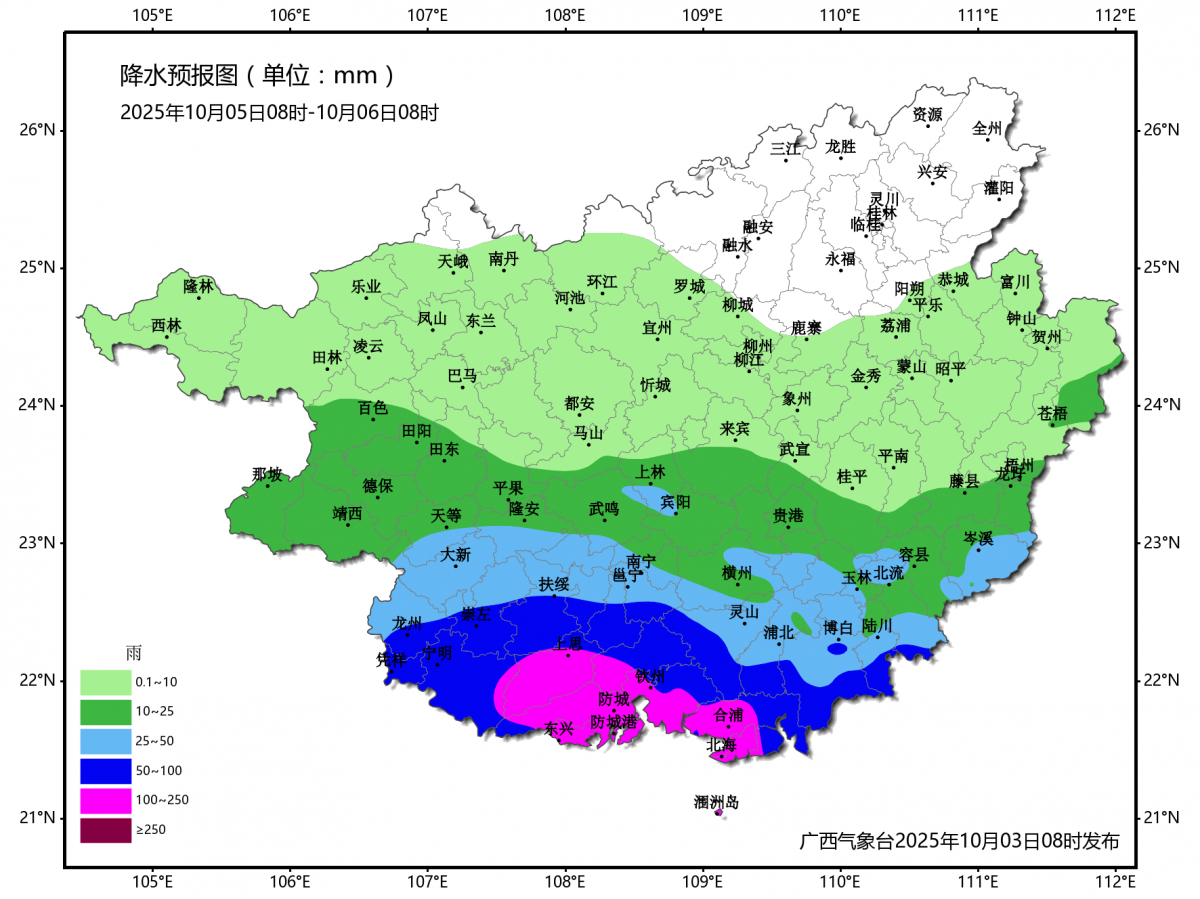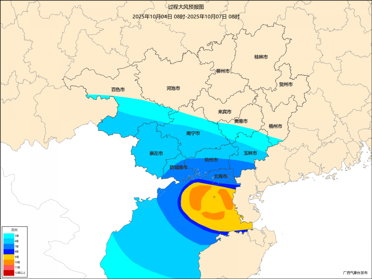 10月6日8時—10月7日8時降雨量預報圖。來源:自治區氣象局 還有北部灣海面的情況,要出海的朋友可得盯緊—— 5日風力最強! 3日:多云有陣雨,東南風4—5級 4日:小到中雨,偏北風6—7級(陣風8—9級) 5日:暴雨到大暴雨(局地特大暴雨),旋轉風9—10級(陣風11—12級) 6日:中到大雨,偏南風6—7級(陣風9—10級) 7日:多云有陣雨,偏東風4—5級