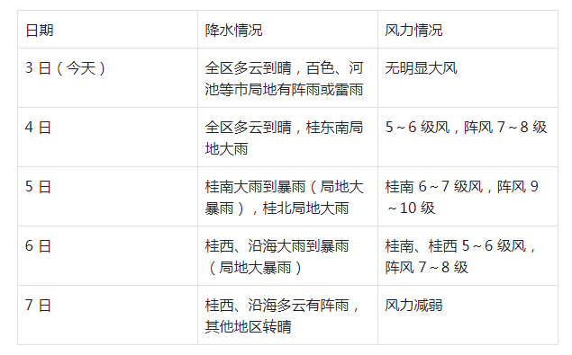 每日具體預報。來源:自治區氣象局 另外累計雨量也得記一下:桂南、桂西40—120 毫米(局地 200 毫米以上);其他地區 5—30 毫米(局地 50 毫米以上)。