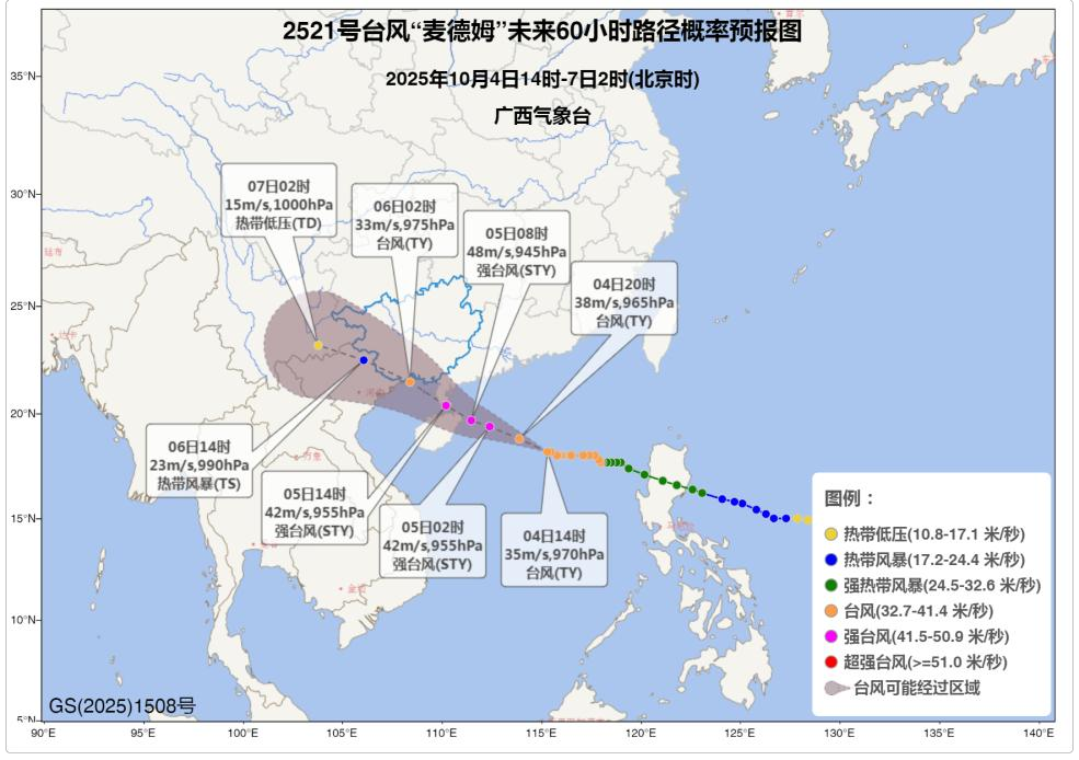 臺風“麥德姆”未來72小時路徑概率預報圖來源:自治區氣象局 風雨影響預報:5—6日最強,桂南桂西暴雨+大風齊襲 受“麥德姆”影響,10月5—6日是風雨最強時段,且本次降水與前期強降水落區重疊,左江、右江、郁江等流域水位已較高,桂南桂西土壤濕度大,災害風險顯著升高。 廣西陸地風雨預報 4 日晚上:全區多云到晴,北海、玉林等市有陣雨或雷雨(局地大雨),桂東南有 5—6 級風、陣風 7—8 級。 5 日白天:北海、欽州、防城港、玉林等市有中到大雨(局地暴雨),其他地區多云到陰有陣雨或雷雨(局地大雨),桂南有 6—7 級風、陣風 9—10 級。 5 日晚上:北海、欽州、防城港、崇左、南寧等市及玉林、百色兩市南部有大雨到暴雨(局地大暴雨),其他地區多云到陰有陣雨或雷雨(局地大雨),桂南仍有 6—7 級風、陣風 9—10 級。 6 日白天:防城港、欽州、崇左、南寧、百色等市及河池市西部有大雨到暴雨(局地大暴雨),其他地區多云到陰有陣雨或雷雨(局地大雨),桂南、桂西有 5—6 級風、陣風 7—9 級。 6 日晚上:百色、崇左、防城港、欽州等市有中到大雨(局地暴雨),其他地區多云到陰有陣雨或雷雨(局地大雨)。 7 日:桂西和沿海地區多云有陣雨或雷雨(局地中雨或大雨),其他地區多云到晴(局地有陣雨或雷雨)。 整體來看,5—6 日桂南、桂西及越南北部累計雨量可達 40—120 毫米(崇左和越南北部 80—110 毫米),局地甚至超過 200 毫米,需重點防范強降雨引發的次生災害。 北部灣海面預報 4 日白天到晚上:小到中雨(局地大雨),偏北風 6—7 級、陣風 8—9 級。 5 日:暴雨到大暴雨(局地特大暴雨),旋轉風 8—11 級、陣風 12—13 級,航行風險極高。 6 日:中到大雨(局地暴雨),偏南風轉偏東風 6—8 級、陣風 9—10 級。 7 日:多云有陣雨或雷雨,偏東風 4—5 級、陣風 6 級。 高風險區域明確:這些地方要警惕洪澇、地質災害 10月4—6日臺風災害中高風險區域及影響