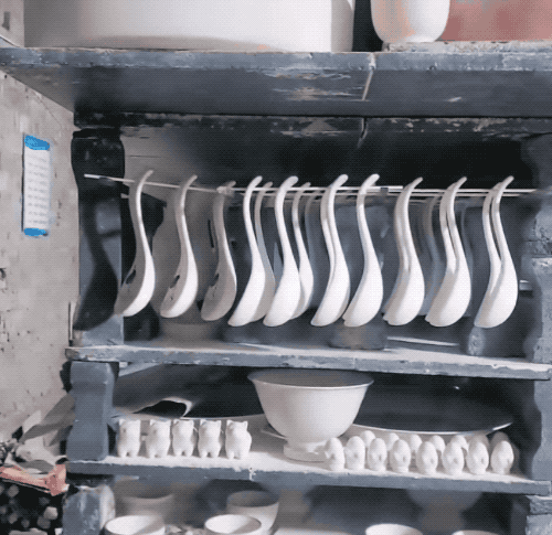 所以,下次下館子吃飯,你可以注意下無孔陶瓷勺的勺柄末端,一般還留有打磨痕跡。這里也是和碗底一樣無釉料的,摸起來比較粗糙。 瓷器還能這樣上釉燒制 講到這里,肯定有朋友要問家里盛湯的大陶瓷勺了。如果同是無孔勺,難道也是做了環吊起來燒好后再去環的嗎? 其實不是。因為大勺子一般只拿來盛湯,不會整個放嘴里吮吸,所以直接用開頭做瓷碗的擺燒工藝就行,這樣更能節省工序。 具體燒制的時候,只需要在大勺底下做兩個小腳當支撐用的接觸面,勺柄頂上再有個地方不上釉料,三足鼎立就可以擺著燒了。