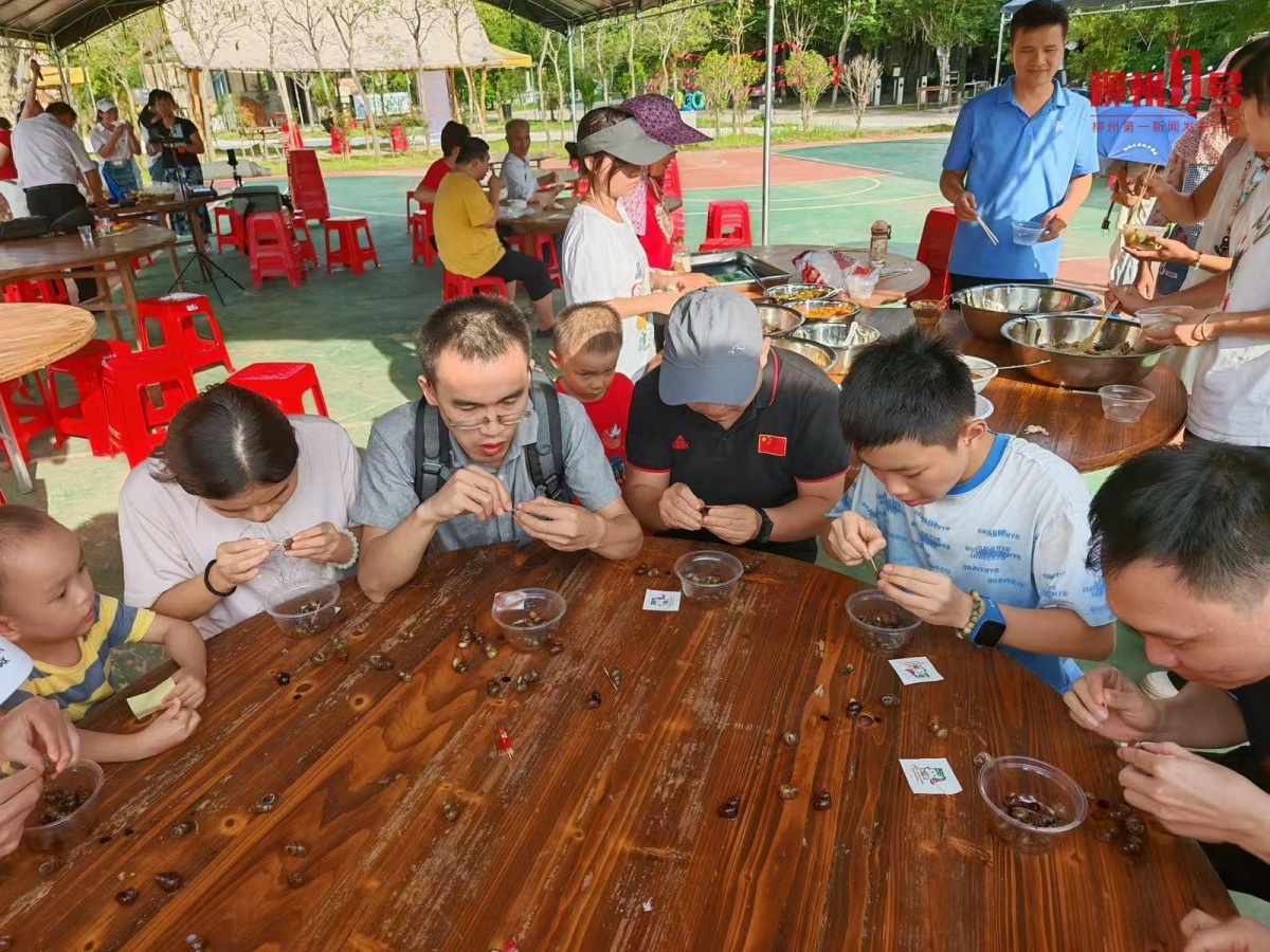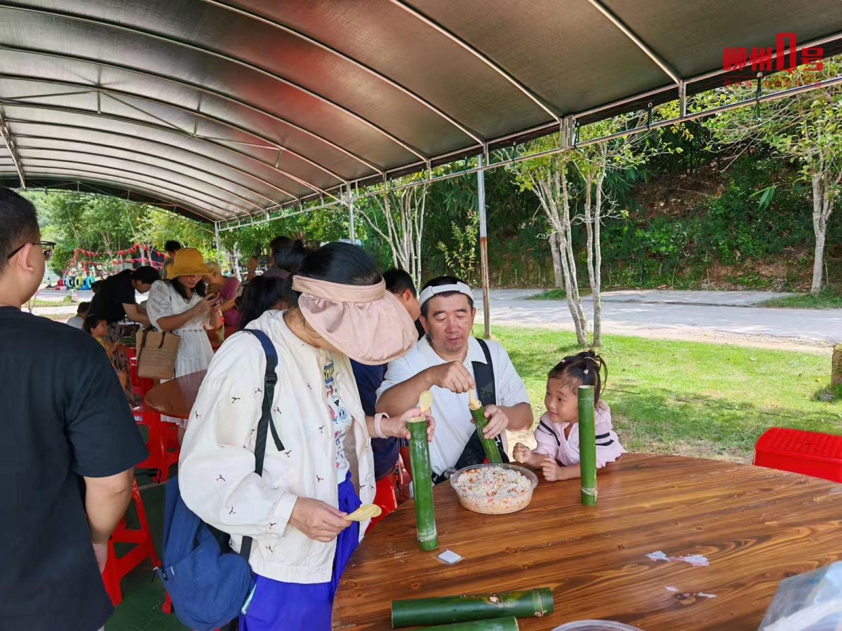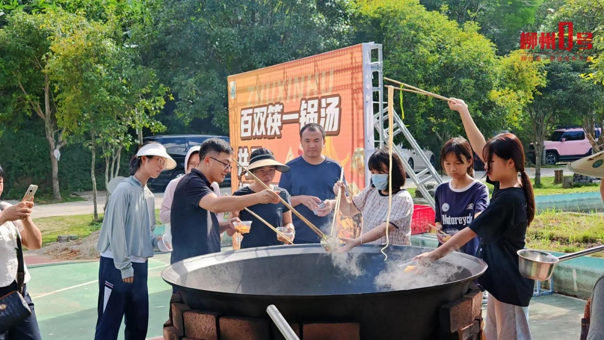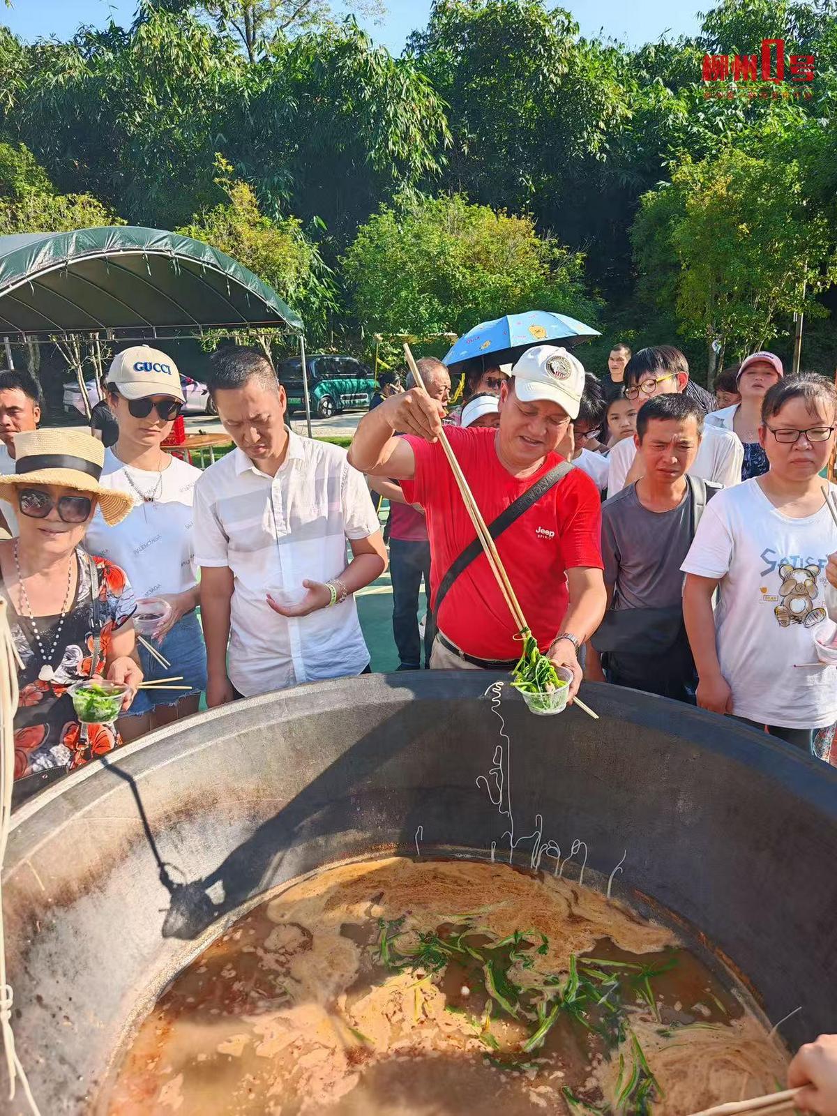 百人嗍粉現場 這個假期,柳南區太陽村鎮百樂村竺心湖生態園的活動豐富多彩,嗍螺挑戰賽、DIY竹筒飯、露天電影、音樂秀等活動從白天持續到夜晚,演員與游客互動,氣氛熱烈,極大地提升了游客的體驗感。現場直徑近2米的大鍋里沸騰著柳州螺螄粉湯,香氣四溢,游客們一起品嘗美味的柳州螺螄粉。