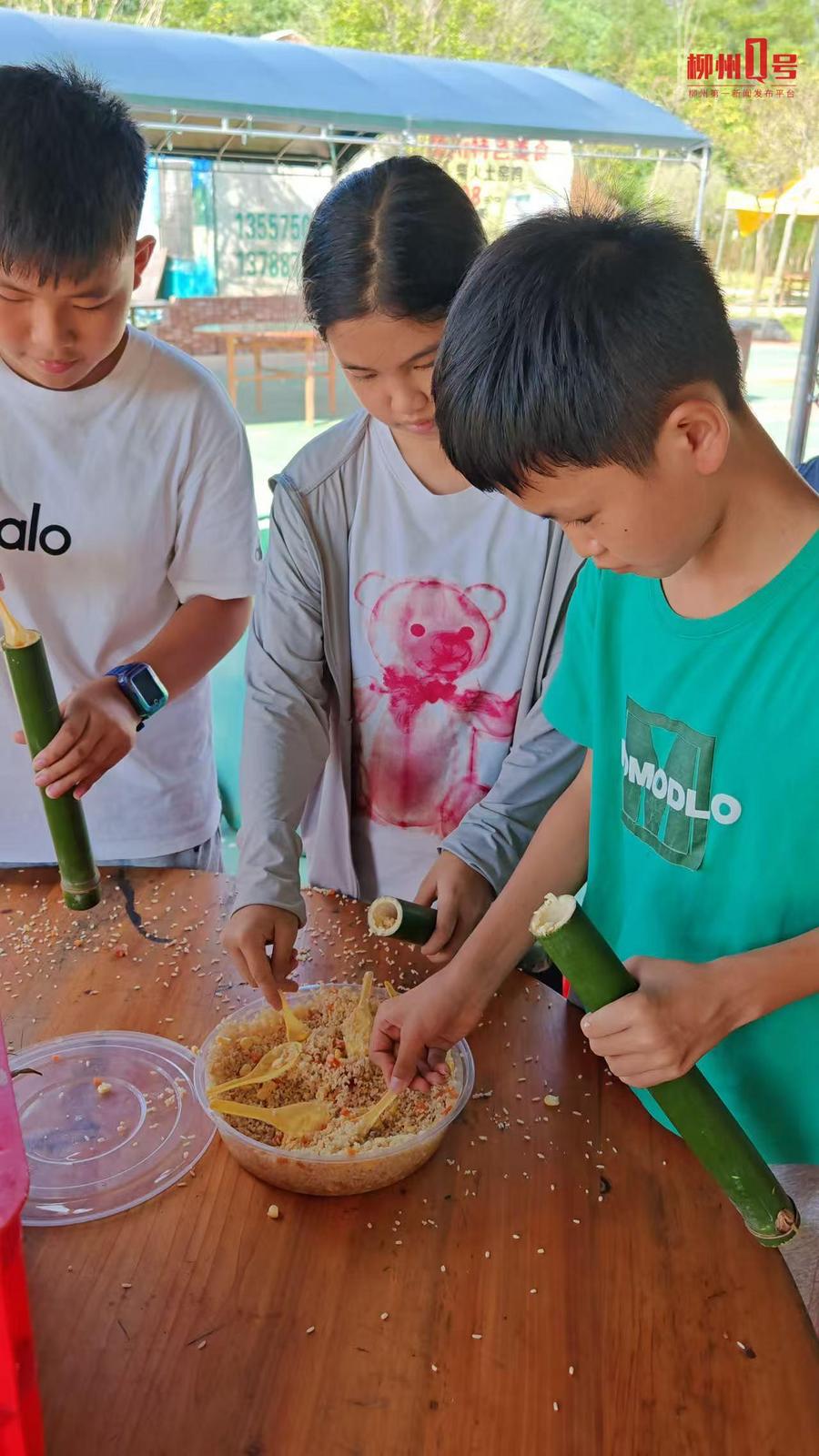 小朋友將花生、糯米等餡料填入竹筒 在柳城縣大埔鎮中回村楊柳岸露營基地非遺體驗區里,糖畫藝人以銅勺為筆、糖稀為墨,在石板上快速勾勒出鳳凰等形狀。來自南寧的7歲女孩陳天琪拿著剛做好的糖畫,開心極了。另一邊的壯錦展示區,色彩艷麗的桌布、圍巾等各類產品擺滿展臺,吸引游客們駐足觀賞。基地負責人熊富權介紹,他們精心設計了一日非遺沉浸式體驗活動:從午后漫游非遺生活市集,到下午參與陶藝手作,最后在篝火晚會上歡慶豐收,讓游客暢享假期。據悉,國慶節前,基地的核心體驗套餐就已訂滿,假期累計接待游客超2000人次。