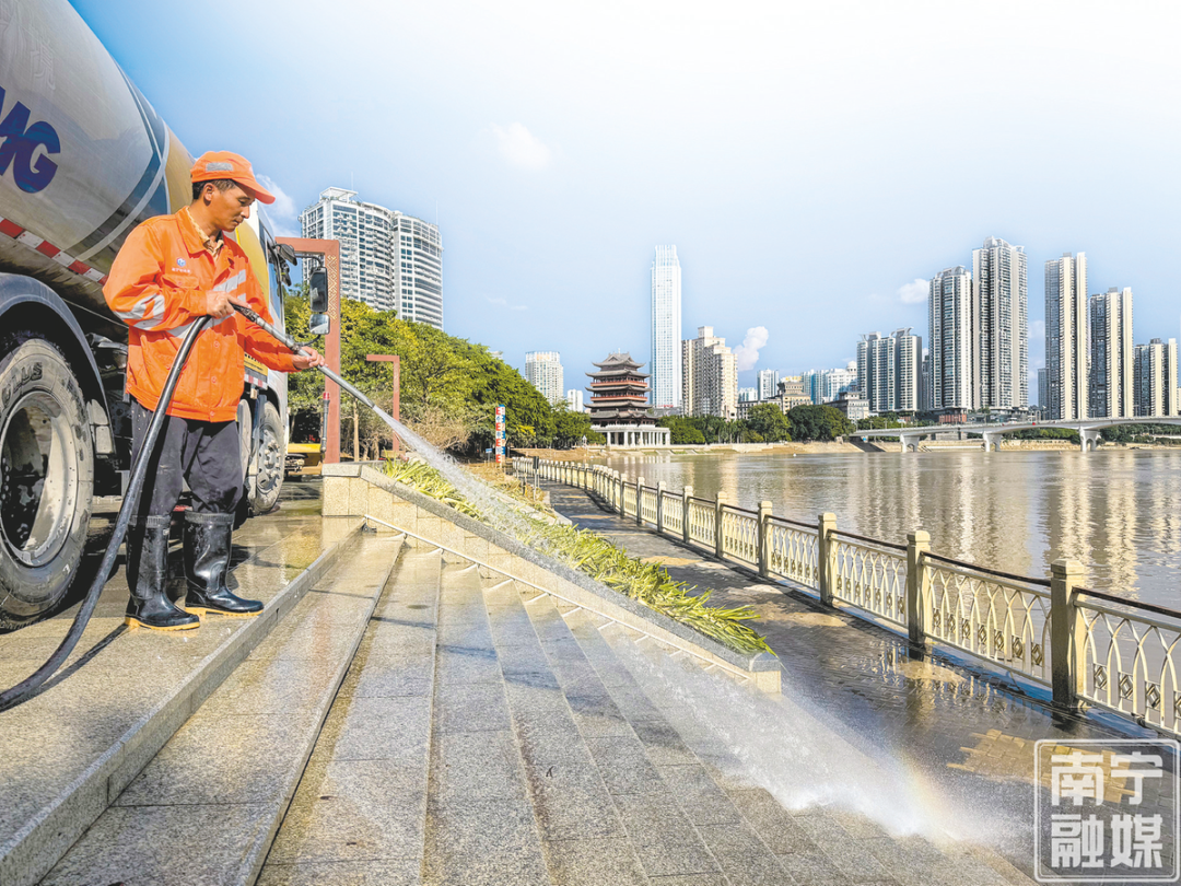環衛人員正在沖洗民生廣場附近江邊步道。記者 潘浩 攝 連日來,邕江兩岸人頭攢動,全民參與、共護母親河的清淤行動正在如火如荼進行,人們頂烈日、戰風雨、迎彩虹,用汗水和辛勞換城市潔凈,讓往日“煙火氣”加速回歸。