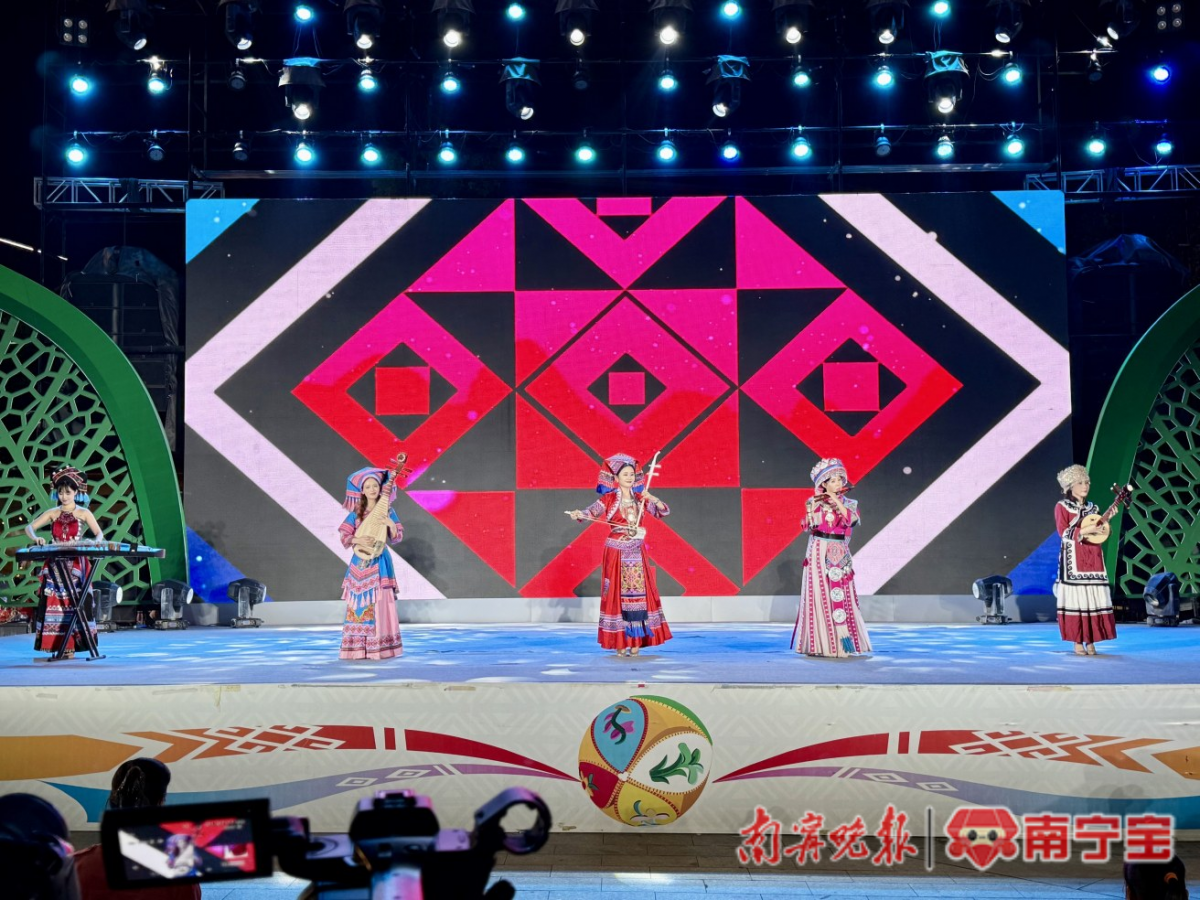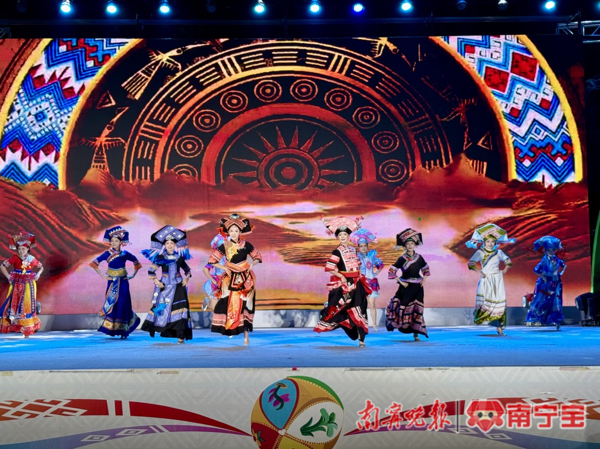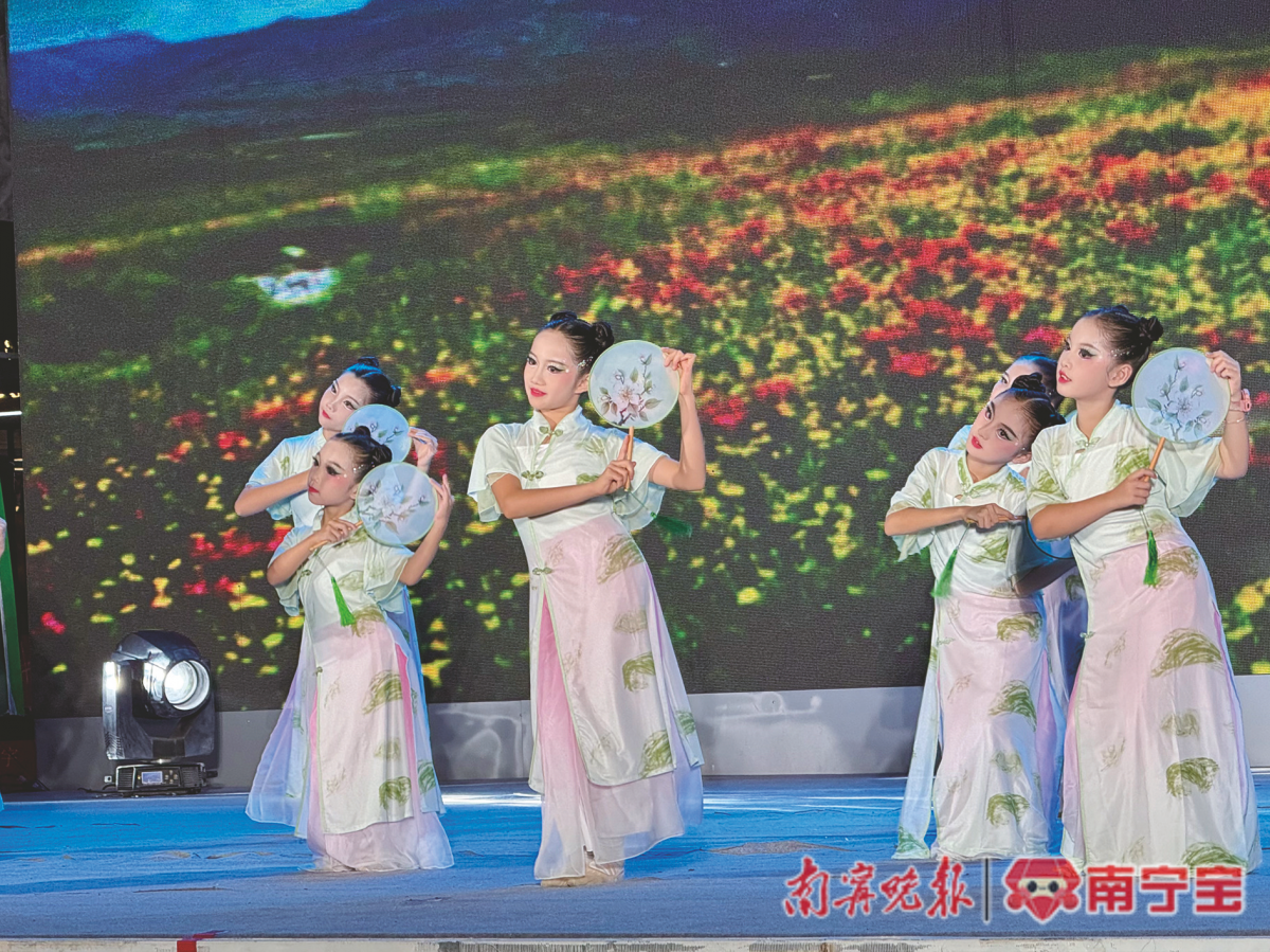 民族樂器奏響《趕圩歸來啊哩哩》。 民族服飾走秀《唄儂醉錦飄八桂》絢麗亮相,五彩斑斕的民族服飾宛如流動的畫卷,將現場渲染得絢麗奪目。原生態壯族三聲部民歌《酒歌長天》以古樸和聲直抵人心,傳遞出壯族文化的深厚底蘊。舞蹈家協會演繹的《花神賦》則以行云流水般的舞姿,營造出如夢似幻的唯美意境。 夜色漸濃,但現場熱情不減。從民樂的歡騰到魔術的奇幻,從古典舞的雅韻到民族走秀的絢爛,整場演出節目豐富、形式多樣,傳統與現代的藝術元素交相輝映,既沉淀著深厚的文化底蘊,也躍動著蓬勃的時代活力。