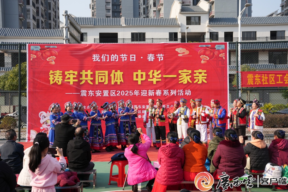 震東集中安置區舉辦迎新春系列活動,社區各族居民群眾共慶佳節。王旭 攝 鄰里情融于日常,更暖在煙火。民盛社區昌泰茗城小區的壯族搬遷戶趙麗紅與丈夫開了一家廣西風味美食店,成了民族團結的“暖心驛站”。酸嘢、五色糯米飯等特色小吃吸引各族群眾常聚,圍坐閑聊間心距漸近。作為單元長,趙麗紅還是“民情收集員”,在與鄰里的日常交流中,把居民反映的停車、垃圾分類等問題記下,反饋給社區。小店不大,但連起民族情,既幫搬遷群眾融入新家園,也為安置區發展添了溫暖力量。 “我們通過文化浸潤與體育競技等有機融合,搭建起了各民族交往交流交融的橋梁,讓大家安居樂業。”隆安縣委常委、統戰部部長覃日敏介紹,震東集中安置區有效整合了統戰、民宗、文體等部門的力量,建設了同心文化廣場、同心文化長廊、同心文化藝術隊等一系列主題突出、特色鮮明的“同心文化載體”,讓不同民族、語言、習俗的各族居民在新環境中和諧共融。 為了精細化服務社區各族居民,更好地推動社區多民族互嵌共融,去年底隆安縣將原震東社區重新劃分為民興、民盛、民樂3個社區,整合了社區黨員干部、“兩代表一委員”、網格員、少數民族代表人士和致富能手等力量,組建了“天天敲門”服務隊、“幫幫團”等9支紅石榴志愿服務隊,形成常態化志愿服務組織網絡,為社區各族居民解決生活難題、提供更貼心的社區服務。