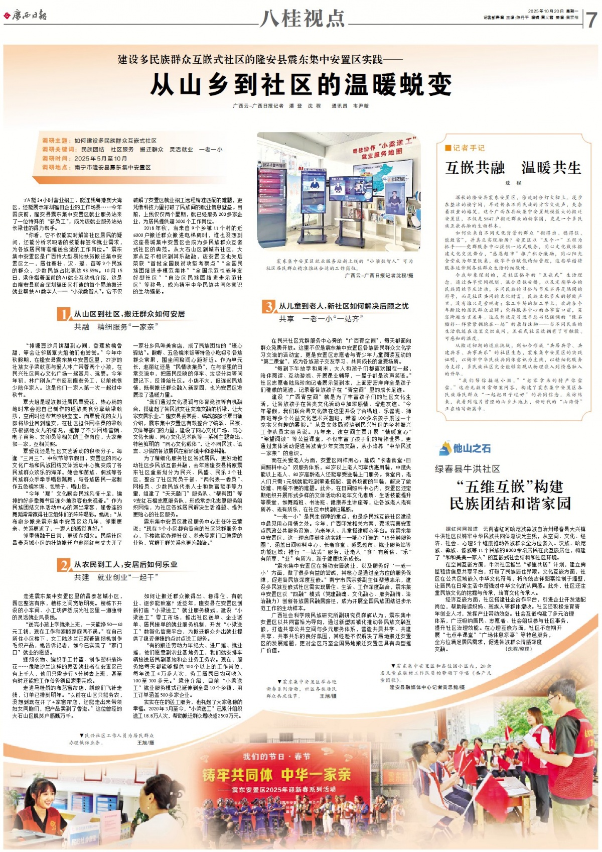 10月20日刊發的《廣西日報》八桂視點專版,關注隆安縣震東集中安置區。 調研主題:如何建設多民族群眾互嵌式社區 調研關鍵詞:民族團結 社區服務 搬遷群眾 靈活就業 一老一小 調研時間:2025年5月至10月 調研地點:南寧市隆安縣震東集中安置區 TA能24小時營業招工,能連線粵港澳大灣區,還能展示深圳福田企業的工作場景……今年國慶前,隆安縣震東集中安置區就業服務站來了一位特殊的“新員工”,成為該就業服務站站長梁佳的得力幫手。 “你看,它不僅能實時解答社區居民的疑問,還能分析求職者的技能標簽和就業需求,為各族居民精準推送合適的工作崗位。”震東集中安置區是廣西特大型易地扶貧搬遷集中安置區之一,居住著壯、漢、瑤、苗等9個民族的群眾,少數民族占比高達98.55%。10月15日,梁佳指著面前的AI就業互動機介紹,這是由隆安縣聯合深圳福田區打造的首個易地搬遷就業幫扶AI數字人——“小梁數智人”。它不僅破解了安置區就業招工遠程精準匹配的難題,更憑借科技力量打破了民族間的就業信息壁壘。目前,上線僅僅兩個星期,就已經服務200多家企業,為居民提供超3000個工作崗位。