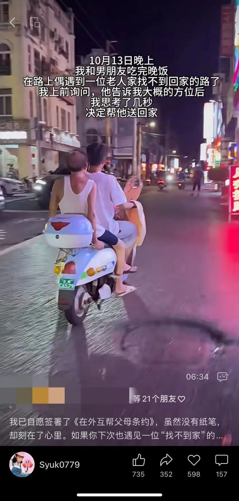 黃女士發布在社交平臺的視頻截圖。 他要找的家 在記憶的最深處 10月13日晚上8時許,黃女士與男友在北海外沙橋與老街交匯處,發現一位白發老爺爺,“他穿著白色背心、短褲、拖鞋,脖子上掛著兩串鑰匙,眼神有些迷茫。”黃女士回憶道,她的外公曾患阿爾茨海默病,她比較容易識別這類老人的狀態,因此,一眼就察覺到老人的處境,便主動上前詢問情況。 得知老人找不到回家的路,并自稱住在“珠海東路”,黃女士心想距離不遠,便決定和男友一起送老人回家。根據老人提供的“民建二巷30號”“商會”“中華街”等地名,他們在老街附近反復尋找。由于有的地名是舊稱,已很難辨認。其間,不少熱心市民加入幫助老人尋家的行列——有街坊努力用方言解釋指路,也有騎車的大叔主動帶路尋找。幾人在老街巷子里穿梭尋覓,不知不覺間過去了1個小時,卻始終沒找到老人記憶中的家門。 為什么兜兜轉轉找不到他的家?直到老人家屬趕到,黃女士才得知了真相。家屬解釋:這里是老人幾十年前住過的地方。黃女士十分感慨,并在視頻獨白中寫道:“后來我才明白,他要找的‘家’不在導航的目的地里,而是在記憶的最深處。” 自己淋過雨 所以總想為別人撐傘 見老人漸顯疲憊,尋覓無果,黃女士選擇了報警求助。通過警情信息匹配,這場愛心接力成功找到了正確的方向。 老人的女婿驅車趕到,氣喘吁吁地連聲致謝:“早上9點多到現在,出來有12個小時了,多謝您啊!” 這份善意,在第二天的短信中依然延續。“小妹早上好,您的善舉令人感動,我們全家人都感謝您,并祝愿您幸福美滿!”老人的家屬給黃女士發來短信,再次表示感謝。黃女士回復說:“叔叔/阿姨早上好!爺爺能安全回到家就是最好的消息。因為自己淋過雨,所以總想著為別人撐傘。” 回復短信時,黃女士不由自主地想起了自己的外公,“他也是經常自己一個人走出家門,出去過幾個小時甚至從早到晚都沒回到家。我無法想象一位老人記憶丟失,無論如何都找不到回家的軌跡時,會多么迷茫和無助……”正是基于這種深深的共情,讓她走在街頭時,一眼就洞察到了老人的困難處境,并及時出手相助。