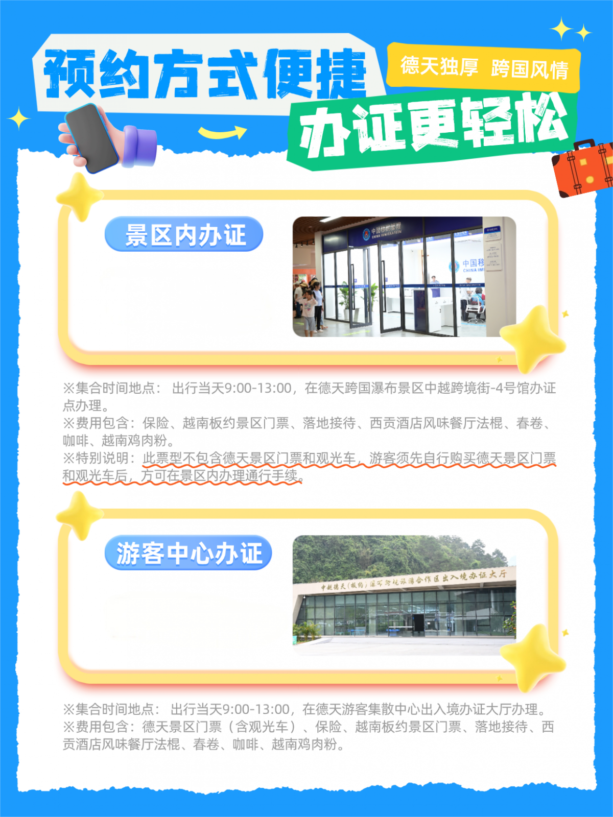 計劃去中越德天(板約)瀑布 跨境一日游的游客 福音來啦! 現在新增景區內辦證通道,手續更簡單、出游更省心,輕松實現“一日游兩國”,便捷度直線拉滿。 兩種預約方式供游客選擇:
