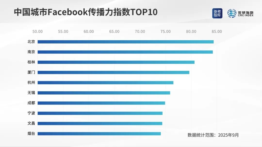 桂林臉書、照片墻賬號截圖 二、各海外社交媒體傳播力情況 中國城市臉書傳播力指數 桂林排名第三 2025年9月,中國城市臉書傳播力指數排序相對靠前的城市是:北京、南京、桂林、廈門、杭州、無錫、成都、寧波、文昌、煙臺。