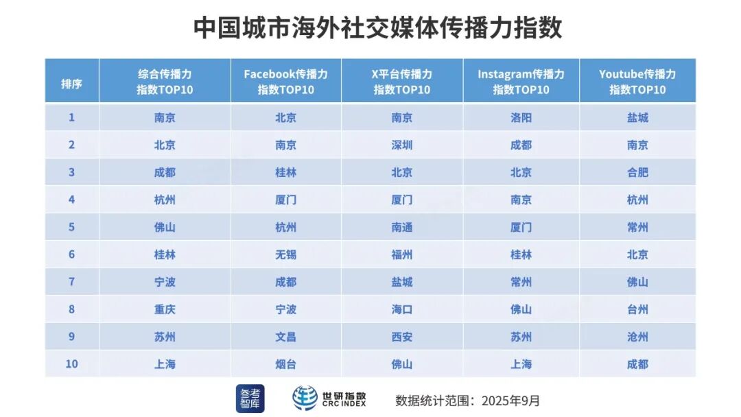 中國城市海外社交媒體傳播力指數TOP10(制圖:世研指數) 一、總體情況 2025年9月,在綜合傳播力方面,排序相對靠前的中國城市為:南京、北京、成都、杭州、佛山、桂林、寧波、重慶、蘇州、上海。