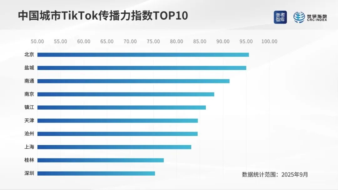 中國城市照片墻傳播力指數TOP10(制圖:世研指數) 中國城市TikTok傳播力指數 桂林排名第九 2025年9月,中國城市TikTok傳播力指數排序相對靠前的是:北京、鹽城、南通、南京、鎮江、天津、滄州、上海、桂林、深圳。