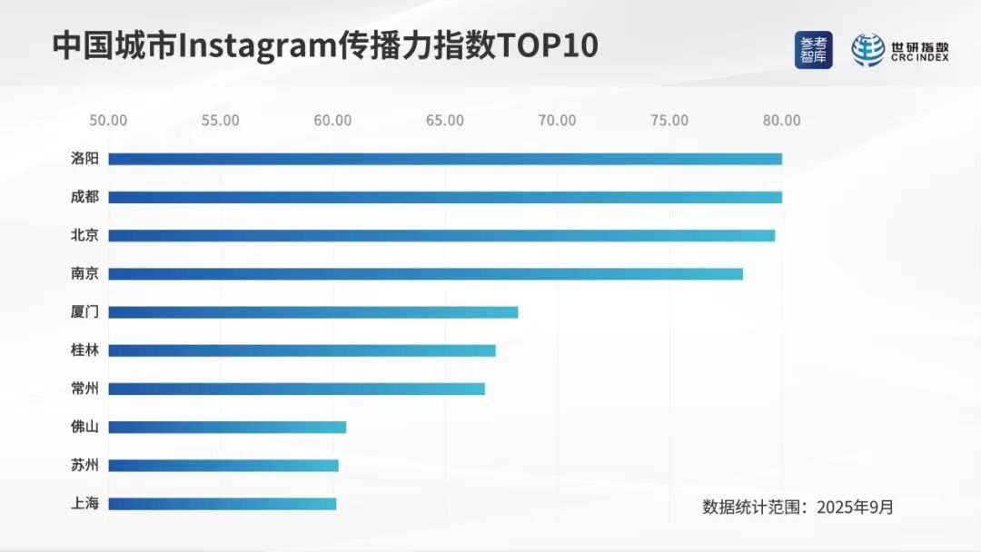 中國城市臉書傳播力指數TOP10(制圖:世研指數) 中國城市照片墻傳播力指數 桂林排名第六 2025年9月,中國城市照片墻傳播力指數排序相對靠前的城市是:洛陽、成都、北京、南京、廈門、桂林、常州、佛山、蘇州、上海。