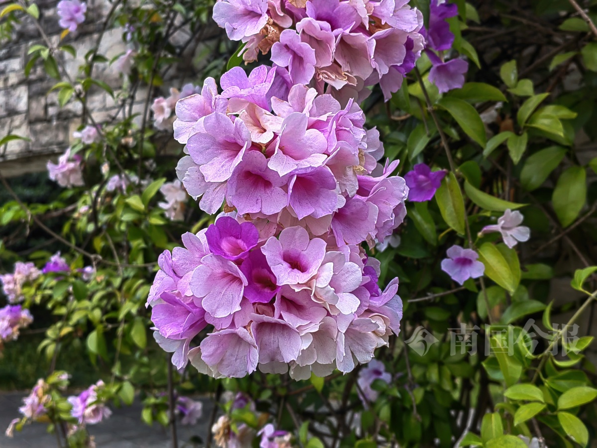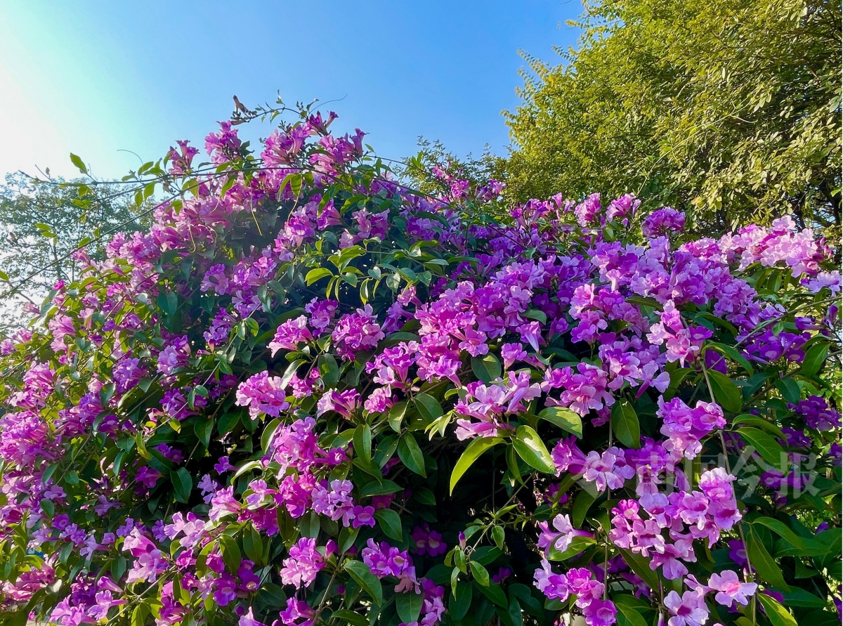 都樂公園盛開的蒜香藤。通訊員 陳曦雨 據園林科技園工作人員介紹,蒜香藤屬紫葳科常綠藤狀灌木,花葉揉碎后散發大蒜氣味,因而得名。 蒜香藤一年會有兩個花期,其中秋冬季最為繁茂。花色初為鮮紫或紫紅,后漸變白,成片綻放時紫、粉、白三色交織,如瀑布自枝頭傾瀉,層次分明,絢爛奪目,宛如天然織就的彩色錦緞。