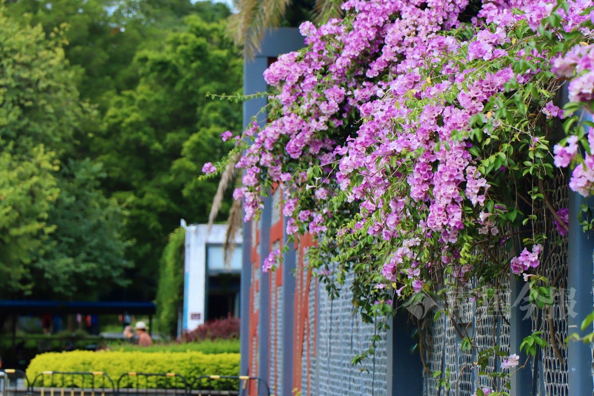 雀兒山公園南門景墻處的蒜香藤。通訊員 韋妮妮 園林科技園、壺東大橋匝道綠地、雀兒山公園南門景墻、都樂公園登山道入口圍墻、河東公園水之苑(東側竹林旁)等地的大片蒜香藤競相綻放,這些地方成為近期社交平臺最熱的“紫色打卡點”。
