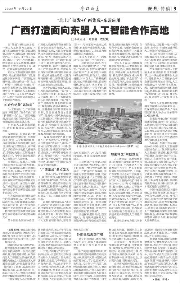 新聞眼10月23日,《參考消息》第9版刊發文章《廣西打造面向東盟人工智能合作高地》,全文如下: