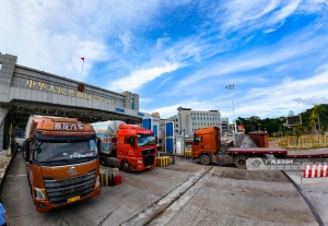 近日,在崇左市寧明縣愛店口岸,中越跨境貨運業務一派繁忙。近年來,愛店邊檢站創新推行“預約通關+動態通道管理”,從源頭上提升通關效率。今年1月至10月上旬,該口岸出入境車輛累計12.9萬輛次,同比增長153.7%;貨物量157.35萬噸,同比增長123.38%。記者 游擁軍 通訊員 石佰華 攝(廣西云-廣西日報)