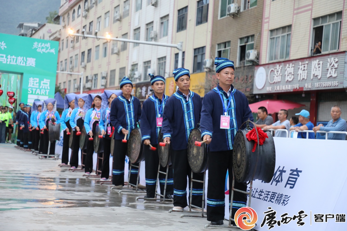 天峨半程馬拉松鳴槍開跑。羅升 攝 賽前熱場表演。林麗峰 攝 當地群眾敲著銅鼓迎接賽事。林麗峰 攝