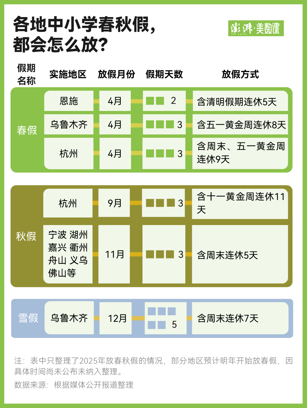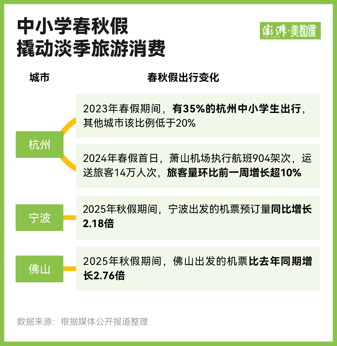 冷空氣南下,讓不少地方一夜入秋。 秋高氣爽,正是出游的好時節。今年,多地的中小學生還將迎來可以在秋天出游的新假期——“秋假”。 今年9月,商務部等9部門印發《關于擴大服務消費的若干政策措施》,明確提出在放假總天數和教學時間總量保持不變的情況下,鼓勵有條件的地方結合氣候條件、生產安排、職工帶薪休假制度落實等因素,科學調整每學年的教學和放假時間,探索設置中小學春秋假。 其實,“春秋假”并不是新概念。2013年國務院辦公廳印發的《國民旅游休閑綱要(2013—2020年)》就提出地方政府可以探索安排中小學放春假或秋假。具體到地方,杭州地區自2004年實施中小學“春秋假”至今,已有21個年頭。 到了2025年,更多地方開始落實中小學生“春秋假”,其模式基本是與清明、五一、國慶等小長假連休。值得一提的是,烏魯木齊市還在今年將12月 1日至12月5日定為“雪假”,并為中小學生提供免費滑雪的機會。