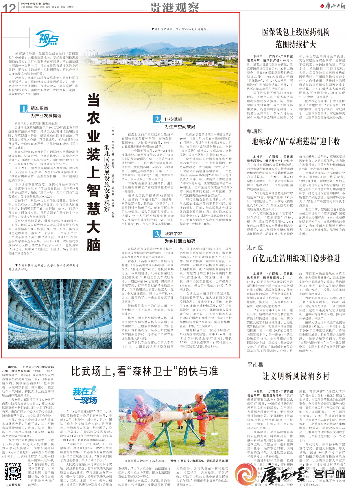 廣西日報版面截圖。 近年來,港北區將現代設施農業作為鄉村振興重要抓手,大力構建設施農業發展場景,進一步拓寬農業生產空間領域,推動農業從“靠天吃飯”向科技引領升級,實現農業增效、農民增收,走出一條現代農業“智”富路。 港北區產業興、百姓富的和美鄉村新貌。廣西云-廣西日報記者 邱石佑 通訊員 陸宏夏 梁思琴 攝 精準招商 為產業發展提速 秋高氣爽,正值項目施工黃金期。 走進港北區港城街道年產100萬公斤淡水魚養殖及圓桶育苗基地項目,只見工人忙著鋪設池塘防滲膜、澆筑混凝土護坡、搭建標準化圓桶育苗池。項目負責人莫航才介紹,項目建成后,年產成品魚100萬公斤,產值約1500萬元,還能帶動20余名村民在家門口就業。 而在總投資1500萬元的廣西鮮牧冷鏈物流項目建設現場,記者看到,倉儲分揀中心、大型冷庫已具雛形,30輛配送車整裝待發。項目預計12月初投產,年營業額1.2億元,提供就業崗位50個。