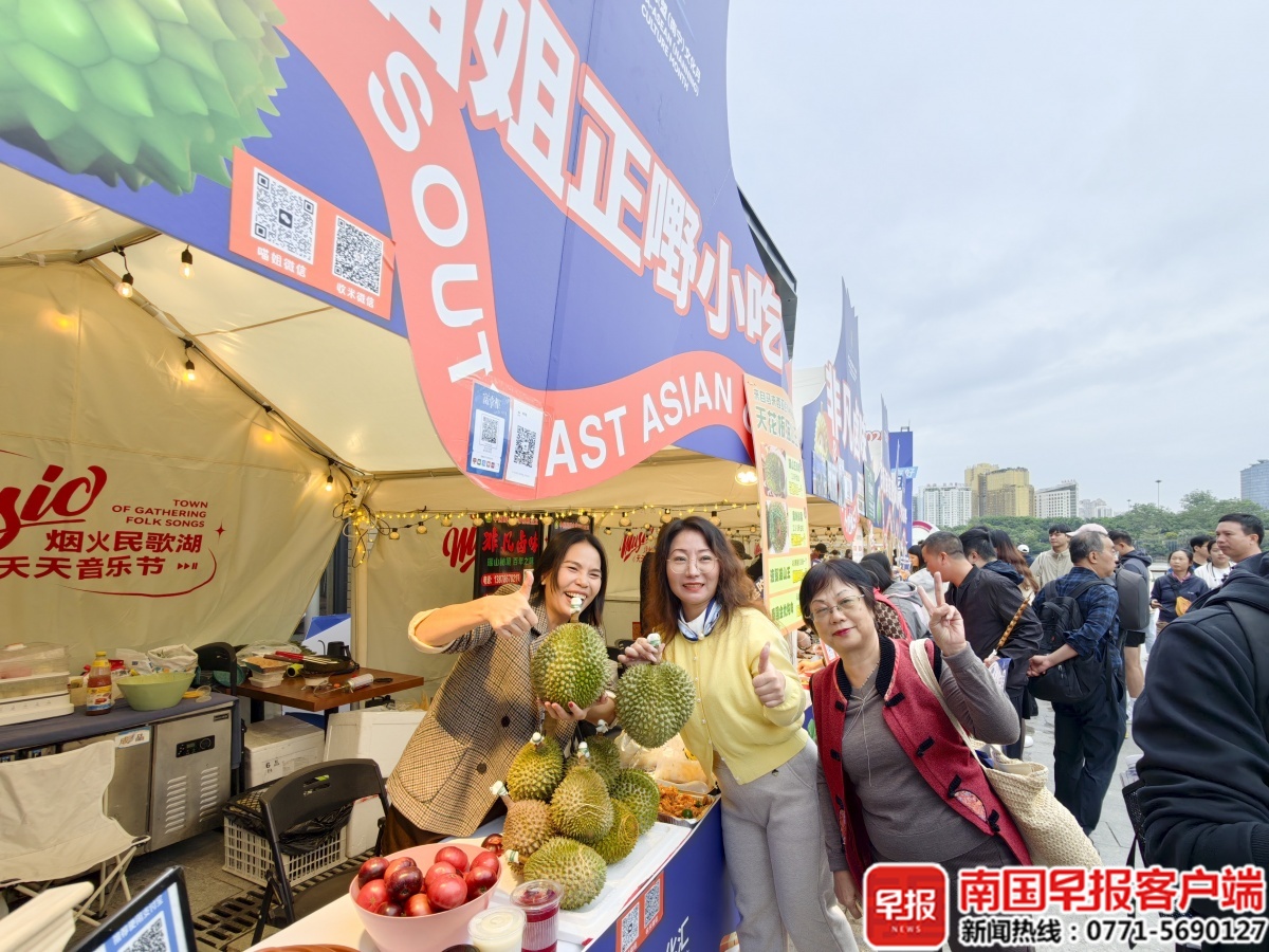游客在現場買榴蓮。 活動以“食”為媒介,現場還設置了“文化大篷車”,集中動態展示中國與東盟各國豐富多彩的傳統服飾、特色舞蹈及民族樂器等,觀眾不僅可近距離觀賞,更可受邀加入互動巡游隊伍,親身體驗異國文化魅力。